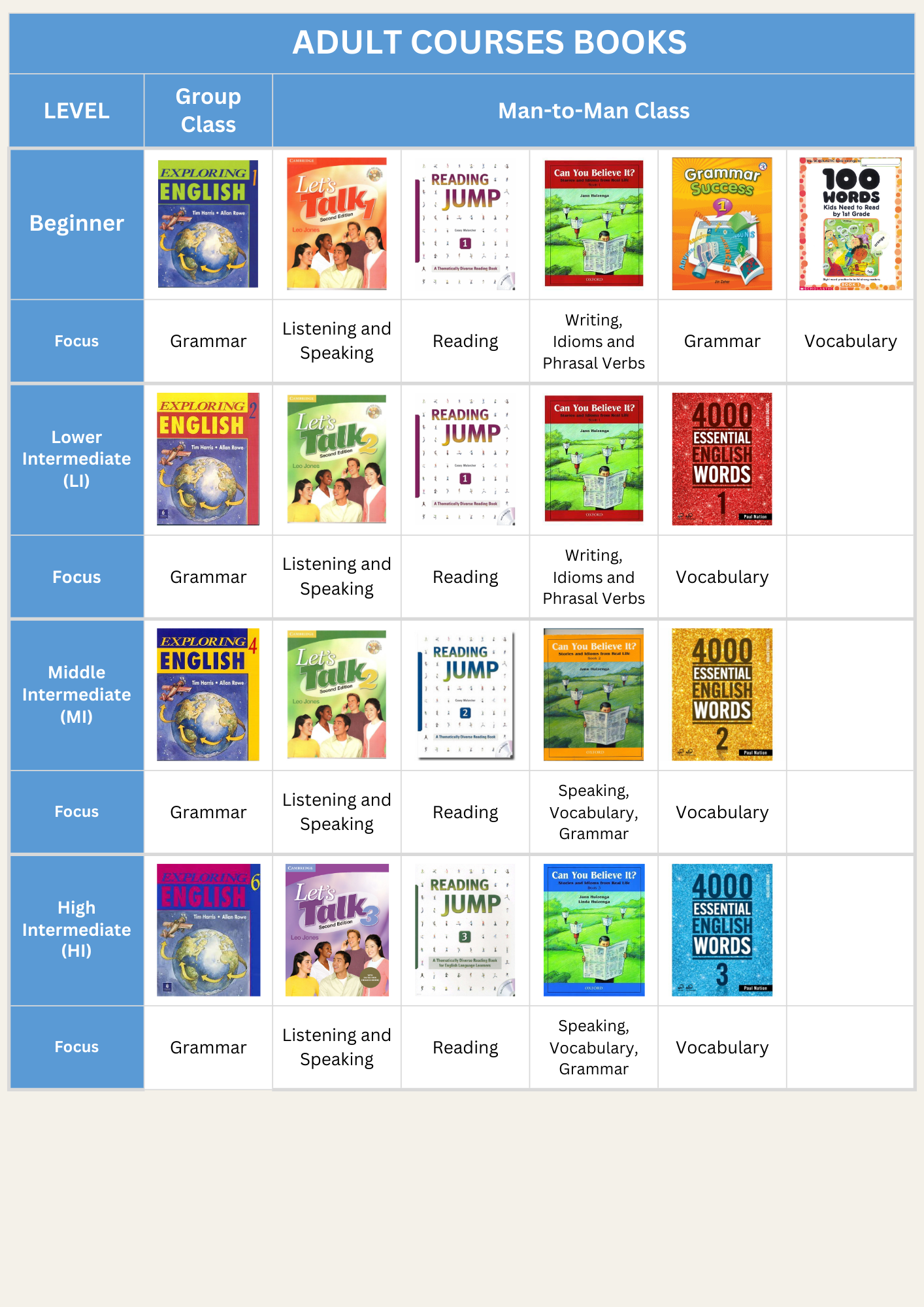 Explore a selection of English learning books that we use and recommend at our academy. These materials are provided for reference only, to help you better understand the resources that support our lessons.